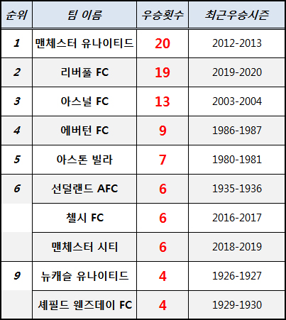 맨체스터유나이티드는... ㅠㅠ 2019-2020시즌에 리버풀이 30년만에 우승을 차지해 두 팀간의 우승 차이는 단 1회이다.