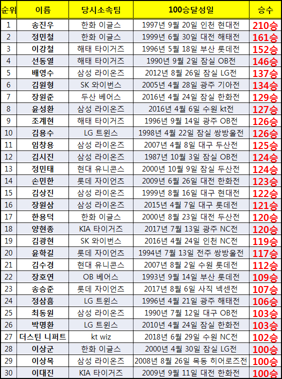 의미다. 하지만 그럼에도 꾸준히 투수의 승리 횟수는 투수의 업적으로 따라다닌다. 그럼 한국프로야구 역사상