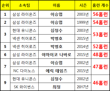 발렌틴선수가 한시즌 60개의 홈런을 치며, 이승엽의 한시즌 56홈런은 한국최다기록으로 남았다. 그렇다면,