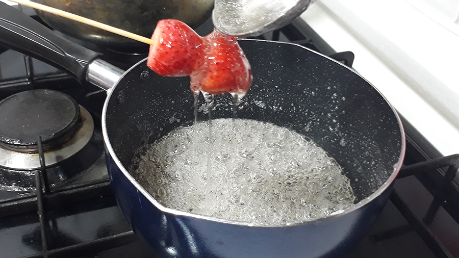 될 시점에 숟가락으로 살짝 떠서 후후 불어보고, 굳으면 그때 과일꼬치에 부으면 된다.
