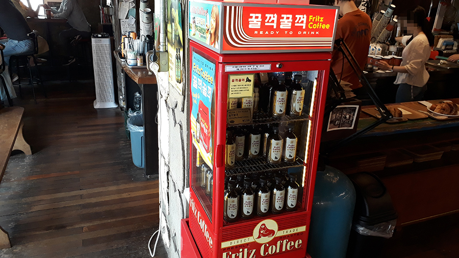 이렇게 레트로스러운 냉장고에, 병으로 커피를 팔기도 한다.