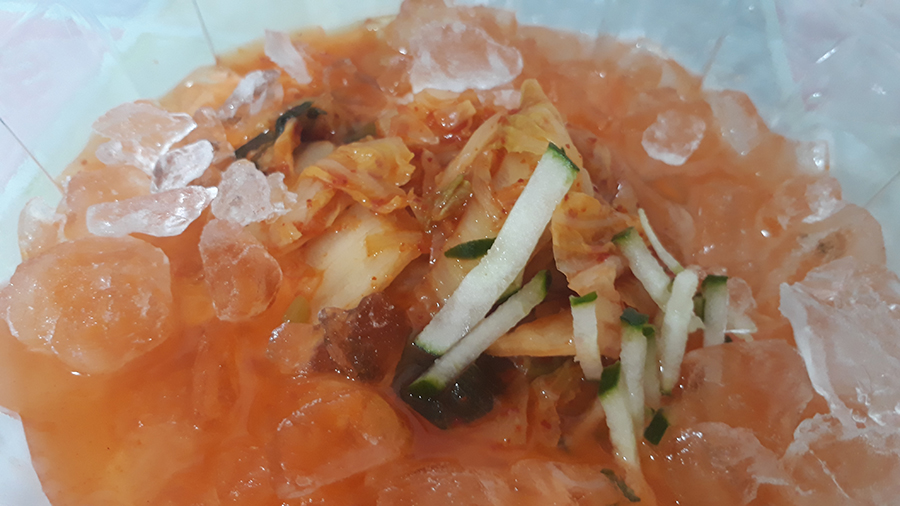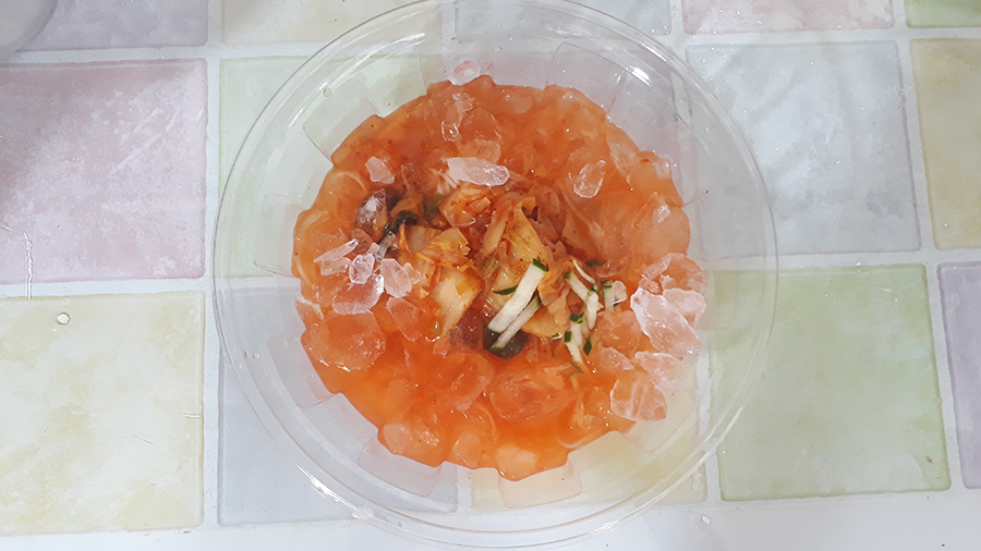 얼음까지 동동동... 참고로 김치국물이 좀 짠편이다. 얼음을 생각해서 짜게 만든듯. 얼음을 넣고 먹다모면,