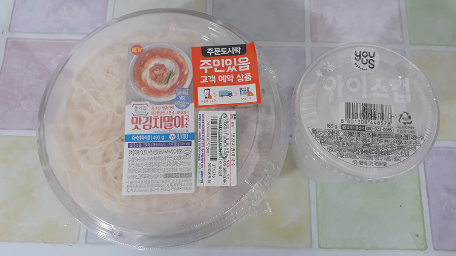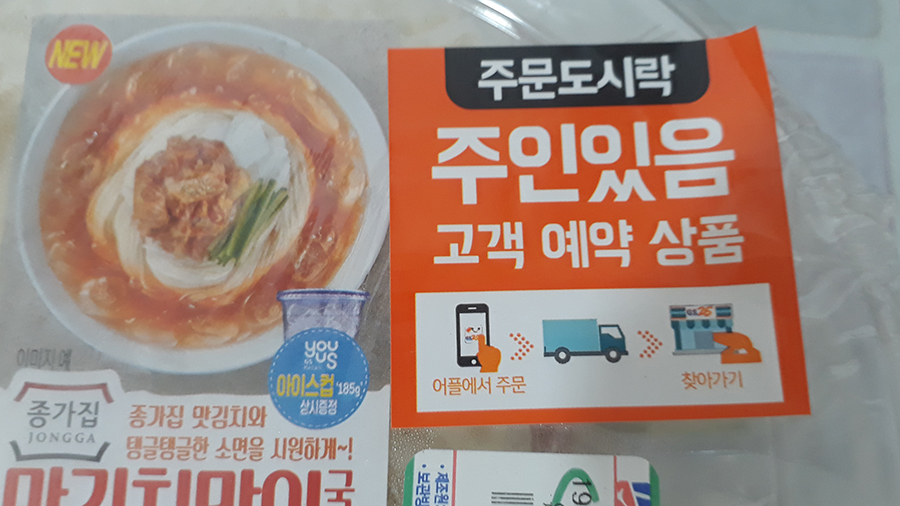 지정된 편의점에 가니 내 국수가 날 기다리고 있다. 다른사람이 못 가져가게 '주인있음'이라고 붙어있다. ㅋㅋ