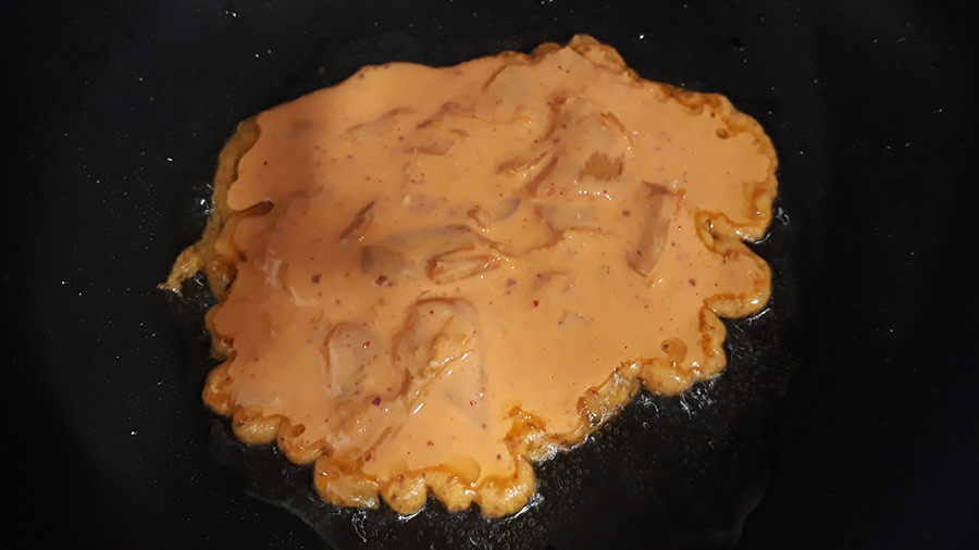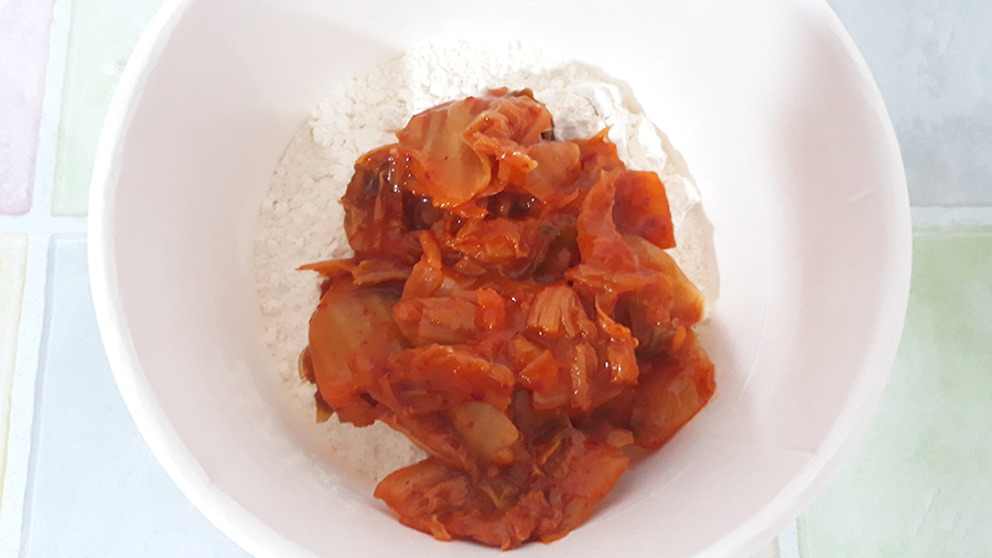 내용물은 딱 두 가지김치소스와 부침가루. 김치소스는 김치 국물이 있는 배추 김지. 반죽하기 전에 김치만