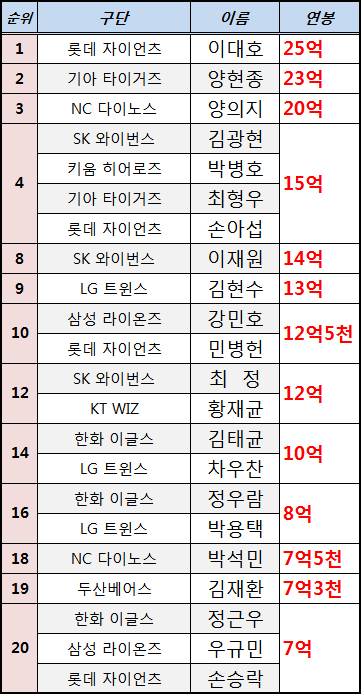 20위까지의 KBO연봉순위. 잘 보자 누가 가성비 가장 좋고, 누가 가성비 가장 떨어지는지...