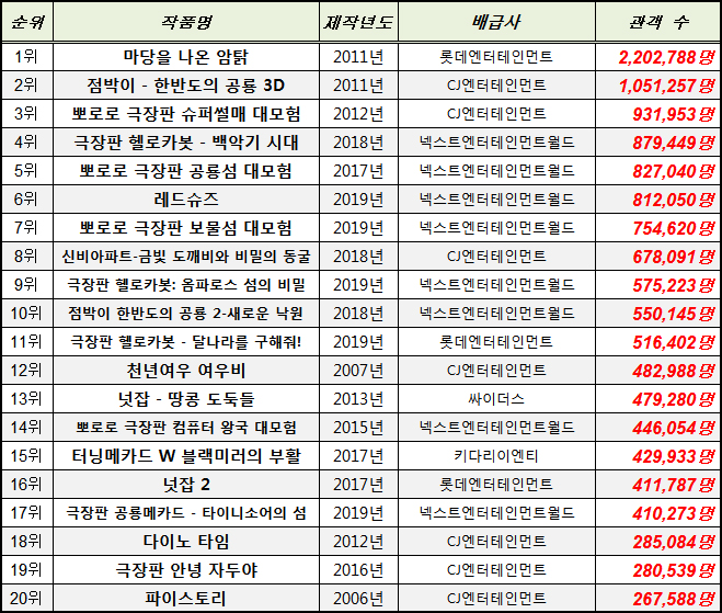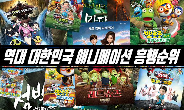 뽀로로와 헬로카봇등 아동물이 주류인것이 살짝 아쉬운 대한민국 애니메이션 흥행순위다.