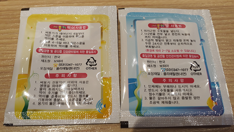 씨몽키 알과 수질정화제를 넣고 며칠만 기다리면 씨몽키가 태어난다고 한다. 그냥 폴리에스텔 봉지안에서