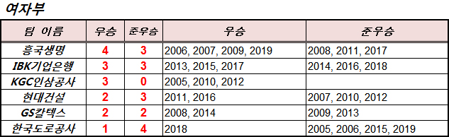 그 중에서도 흥국생명과 IBK기업은행이 각각 7회, 6회 챔피언결승전에 최다진출을 했으며, 여성부 V리그의
