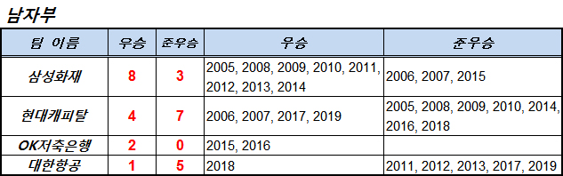 V리그 출범 초대 우승팀이며 전통의 강호이지만, 2015년까지 매번 챔피언결정전에 진출했으나,