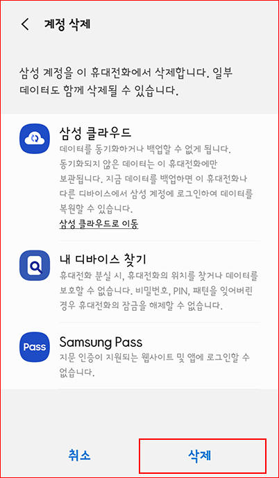 계정삭제를 누르면 비밀번호 입력 후에 해당 기기에서 계정이 완전히 삭제된다.