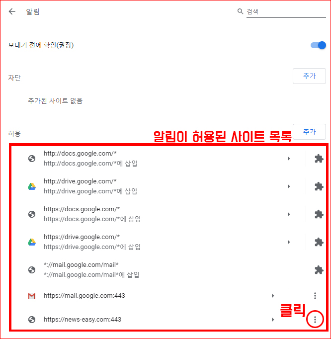 클릭을 하면 내가 알림을 허용해준 사이트목록이 뜨게된다. 이번에 내가 차단할 알림은 news-easy.com이다.
