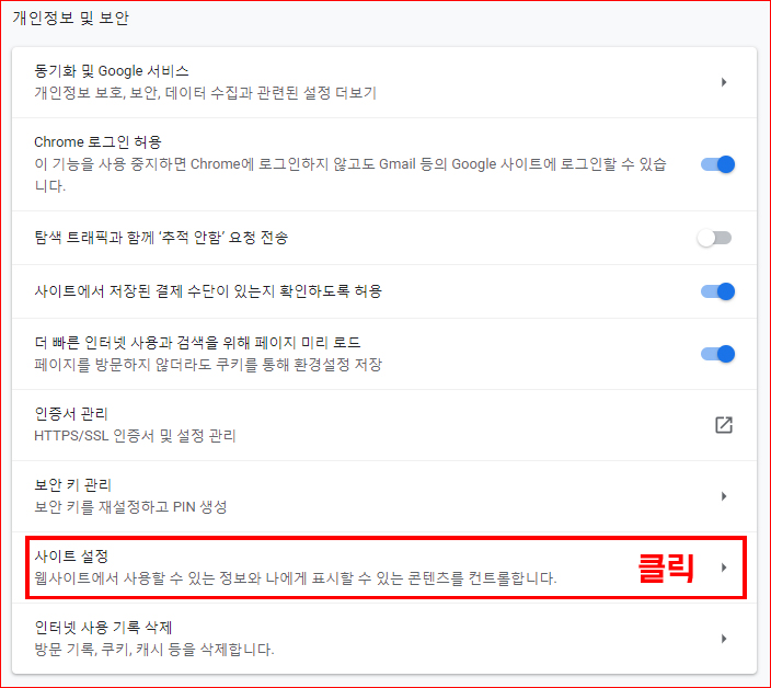 설정에 들어가면 왼쪽에 여러가지 메뉴가 있는데, 고급(클릭) -> 개인정보 및 보안으로 진입하자.