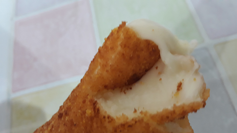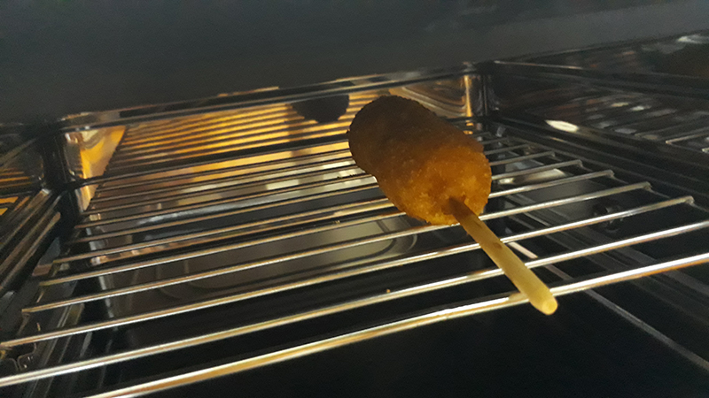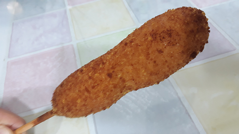 자 이제 맛을 볼 시간~~ 적당한 색으로 잘 익은 퀴진 치즈 크리스피 핫도그.
