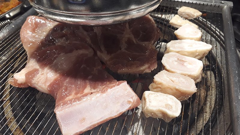 돼삼이 (참숯통삼겹), 돼갈이 (돼지갈비, 목살 섞여있음) 그리고 돼지껍데기나 원조막창이 함께 딸려나오는