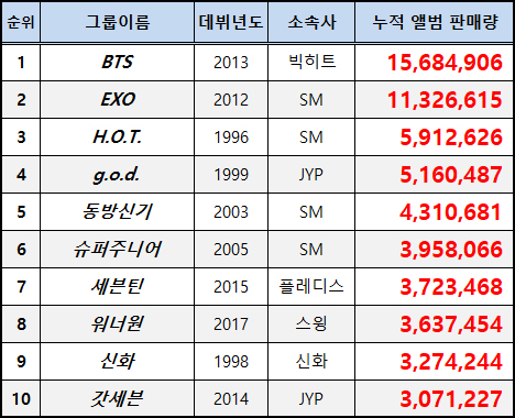 | 걸그룹 역대 음반 판매 순위 ㅣ SES, 핑클부터 트와이스 레드벨벳까지 음반 최강 걸그룹은? (0) | 2020.06.19 |