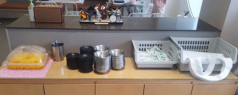 단무지와 물티슈 앞치마 앞접시는 셀프~